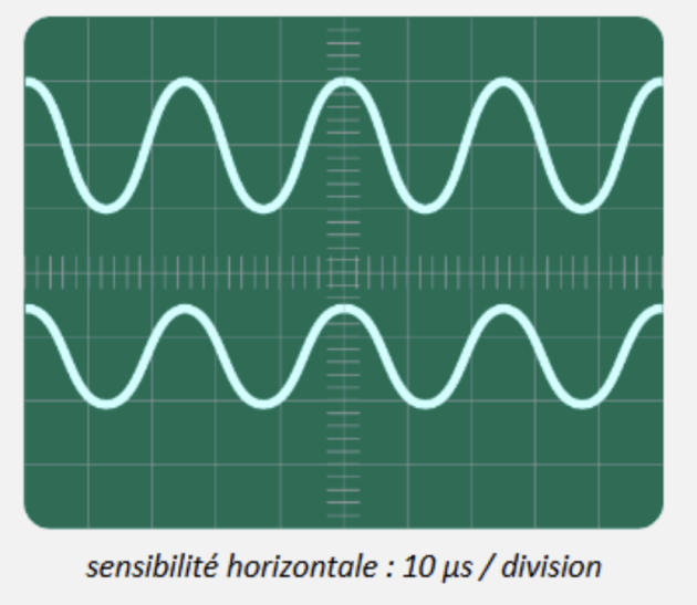 Résultat :On obtient deux signaux de formes différentes, le second ayant un retard de \(60\ \mathrm{\mu s}\) sur le premier.